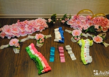 Продаю свадебные украшения на машину: цветы с кольцами на крышу, цветы на радиатор, 4 цветка с лентами на ручки машины и...