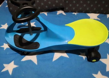Отличная машинка, ярко бирюзового с салатовым цветов, из отличного пластика! Управляется рулём или ребенок отталкивается...