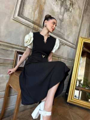 Приталенное платье с красивым кружевным воротником, украшенным стразами и жемчужинами.