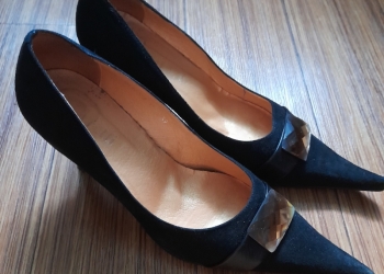 Туфли 37 размера, черные, замшевые, бархатистые, на тонкой танкетке на всю стопу, поэтому очень удобны, можно носить в офисе...