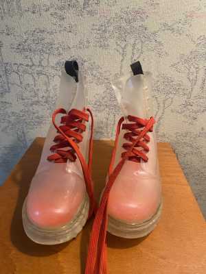 Красивые белые ботинки типа шелиз , мартинс , гриндерс . Внутри мех подошва зелёная , яркая шнуровка.