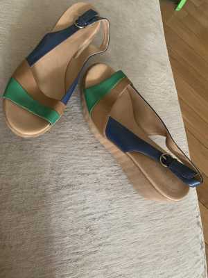 Оригинальные кожаные эффектные босоножки Paolo Conte. Цвет - бруснично - изумрудный. Рельефный каблук - танкетка.