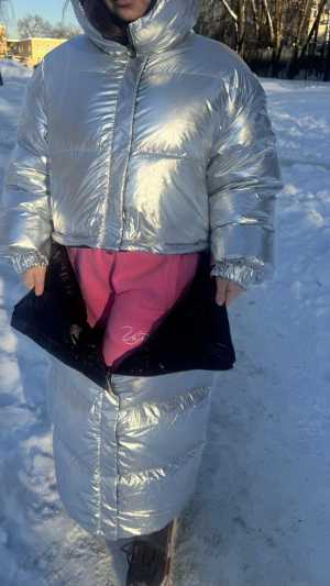 Пуховик рассчитан до -25*,длина 110см,по бокам кнопки