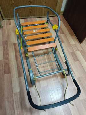 Детские санки на колесиках, с ручкой и тормозом. Все дощечки целые. Ручки можно переставлять как Состояние отличное.
