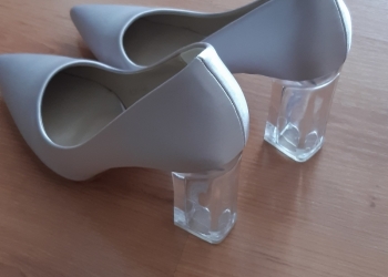 Новые, разм. 41 (идёт на 39-й), текстиль, цвет светло-серый с лёгким переливом, каблук прозрачный, высота 10 см.