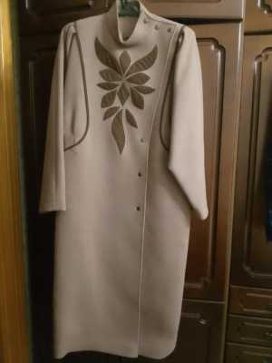 Пальто светло-клричневое с аппликацией и красивым руковом. На спинке шлица. Застежка на кнопках.