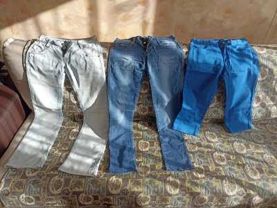 Много джинс. Размер примерно от 42 и более. 200 рублей за одни джинсы или брюки. Есть льняные брюки.