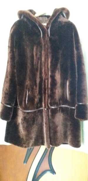 Мутоновая шубка "Алеф" шоколадного цвета с капюшоном. Размер 50,.Длина (плечо + рукав - 77 см).Длина шубки - 97 см.