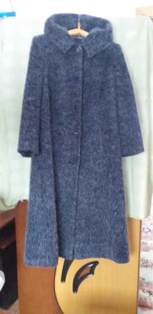 Серое зимнее пальто фирмы "Кристи"с капюшоном и разрезом сзади. Состав: мохер 50%, шерсть 50%, полиамид 25%. Размер 52.