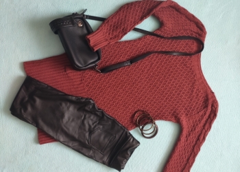 Вязаное терракотовое платье-туника, 199р, черные лосины из экокожи, 199р.