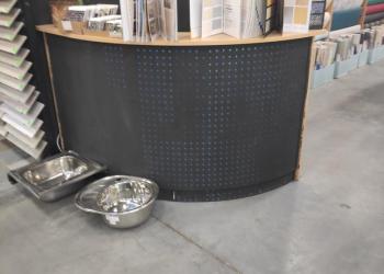 В наличии 1 стол 1.8 метра с серой столешницей и дверцей с боку - 17000р. 1 угловая стойка - 7000р/шт.