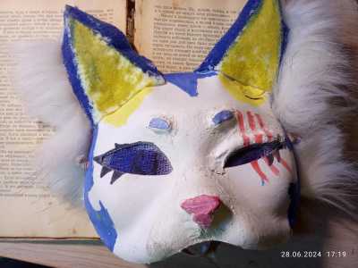 Маска сделана из папье-маше, резинка присутствует сделана в этом году обклеена мехом по бокам крашена акрилом, маркерами