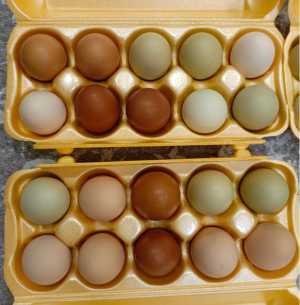 От своих домашних кур-молодок. Куры находятся на свободном выгуле, кушают траву, гуляют на солнышке.