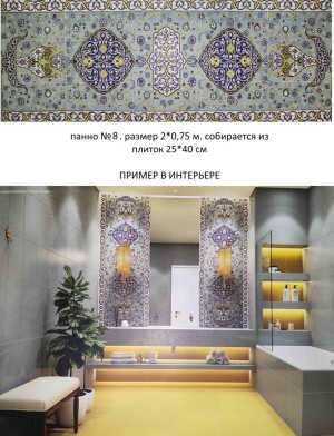 Плитка керамическая. Собирается в рисунок. Рисунок 2*0.75 м. ( 1,5 м2). Состоит из плиток 25*40 см. Стоимость 3200 за м кв.