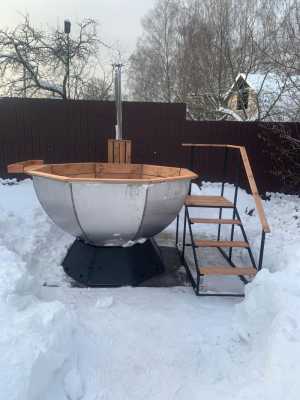 Банный чан из нержавейки 190 см с отделкой лиственница на подставке с ветрозащитой дымоходом и топкой