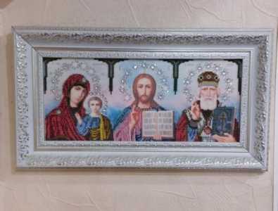 Вышитая бисером икона-триптих иконостас (Богородица, Иисус, Николай Чудотворец). Оформлена в багет.