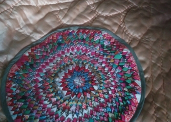 Круглый плетеный коврик. Выполнен в технике чичковского плетения из трикотажа и ткани. Диаметр 76 см.