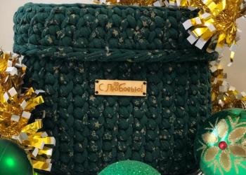 Новогодняя корзинка из трикотажной пряжи 100% хлопок. Цвет зеленый с золотистыми звездочками.