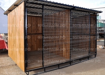 Размер данного вольера 1.5х3м.Высота 1.5м. Каркас проф.труба 40х25.Обшит проф.лист. Крыша проф.лист.
