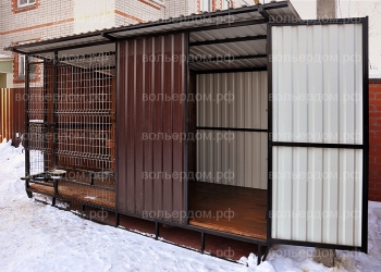 Размер данного вольера 2х4м.Высота 2м. Хоз.блок 2х2м. Каркас проф.труба 40х25. Обшит проф.лист. Крыша проф.лист.