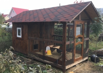 Размер курятника 1.5х3х2м. Обшивка строг.доска 20х100(имитация бруса). Утепление мин.плита. Внутрянняя отделка ЮСБ панели.