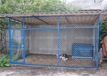 Размер данного вольера 2х9м.Высота 2м. Хоз.блок 2х1м. Вольер для 2 собак. Каркас проф.труба 40х25.Решетка проф.